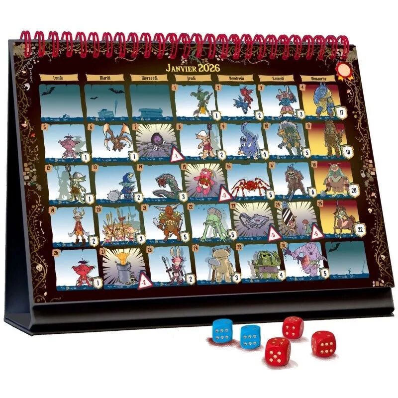1 calendrier, 1 aimant représentant votre héros, 5 dés à six faces et un livret de règles