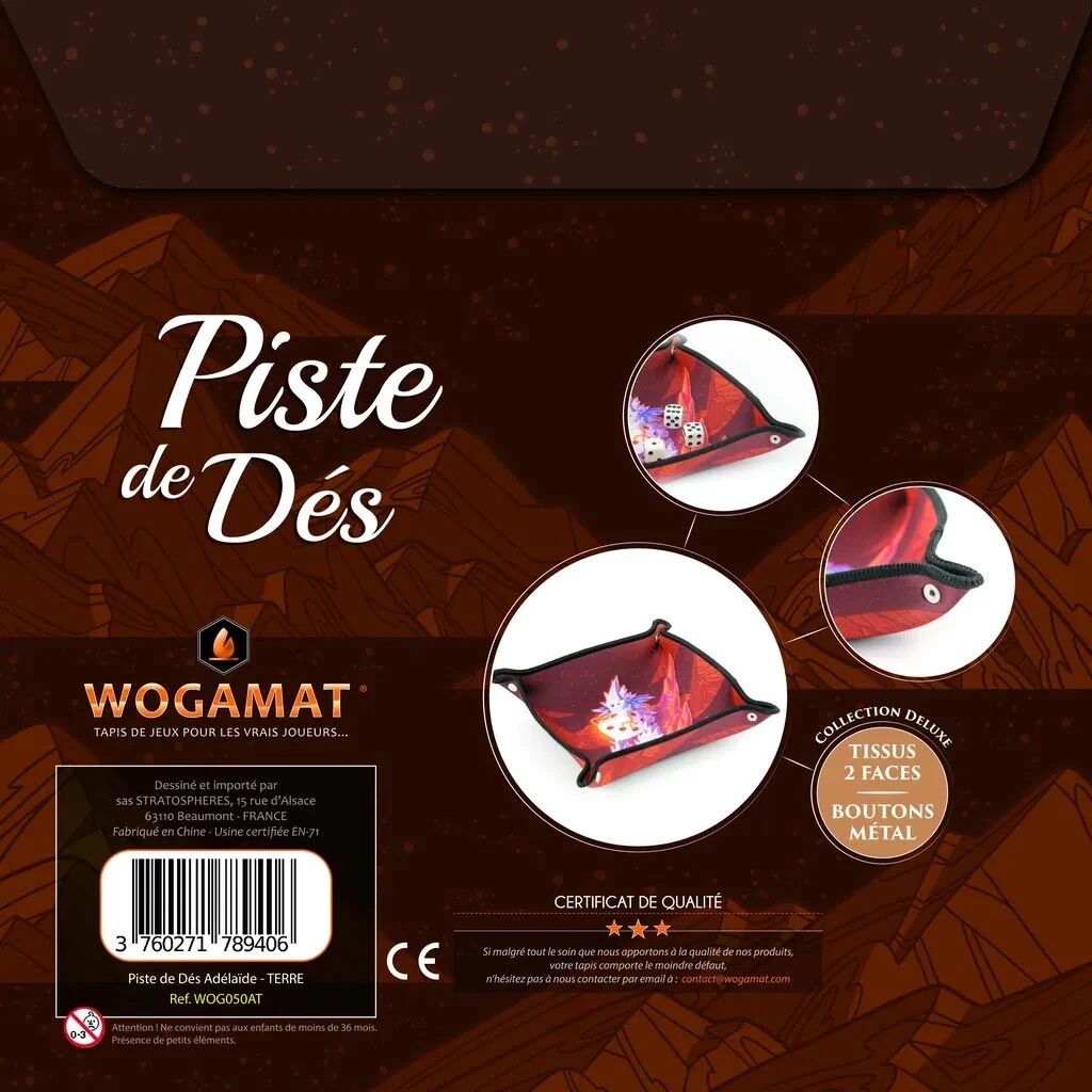 Pratiques et nomades, les pistes de dés en néoprène de la marque Wogamat mesurent 2,5mm d'épaisseur, sont disponibles en 3 décors : Feu, Eau et Nature. Elles mesurent à plat : 21x21cm et se montent en quelques secondes grâce aux boutons pressions qui permettent de former le bol.