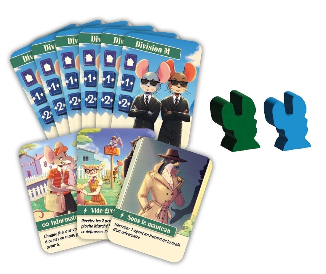 21 cartes (63 x 88 mm) dont 6 cartes Agent et 15 cartes Marché Noir, 2 pions Division M, 1 livret de règles