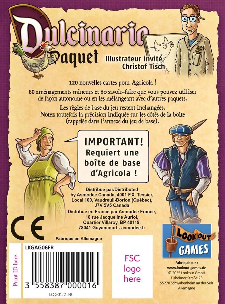 L'extension Dulcinaria pour le jeu de gestion Agricola apporte une nouvelle richesse à vos parties grâce à un ensemble de 120 cartes entièrement inédites. Cette extension renouvelle vos possibilités en introduisant de nombreux Aménagements mineurs et Savoir-faire qui viennent enrichir votre manière de jouer dès la mise en place.
