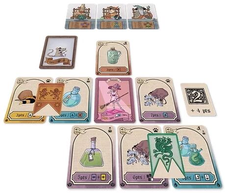Après cinq tours, on procède au décompte détaillé : chaque carte de votre tableau peut rapporter des points selon sa position, ses associations ou les objectifs en jeu. Le sorcier ou la sorcière qui obtient le plus haut score remporte le concours.