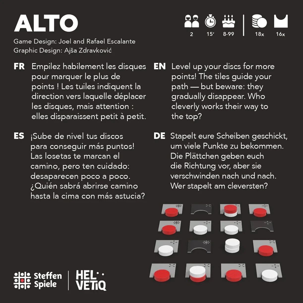 Rapide, malin et très accessible, Alto s’impose comme un jeu de réflexion abstrait captivant, mêlant anticipation, placement et opportunisme dans des affrontements courts sublimés par un matériel élégant.