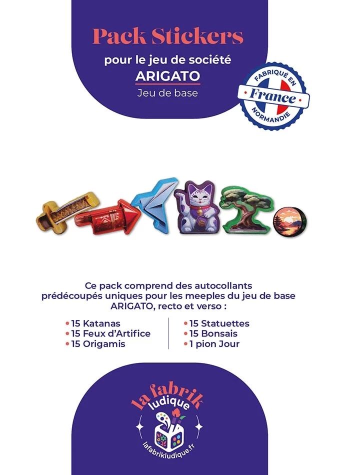 Ajoutez du style et de la lisibilité à vos parties de Arigato grâce à ce pack de stickers conçu pour le jeu ! Chaque autocollant vient embellir les pions en bois pour une immersion renforcée.
