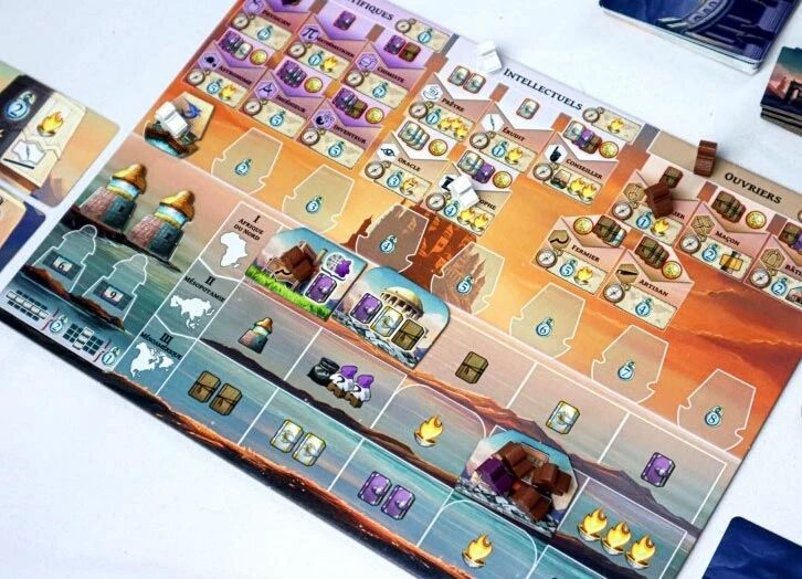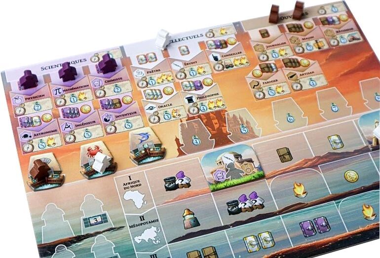 Au centre de la table, vous évoluez sur un plateau circulaire rotatif représentant la cité d’Atlantis. À chaque nouvelle année, des catastrophes font pivoter les anneaux de la ville, modifiant radicalement l’accessibilité des actions. Au fil des manches, vous devrez placer votre roi pour recruter des citoyens, collecter des ressources, construire des bâtiments, développer des savoirs et activer de puissants effets. Les citoyens peuvent être formés, envoyés en exil, affectés à des ateliers ou embarqués sur des navires, chacun de ces choix ayant un impact direct sur le score et la progression de votre civilisation.