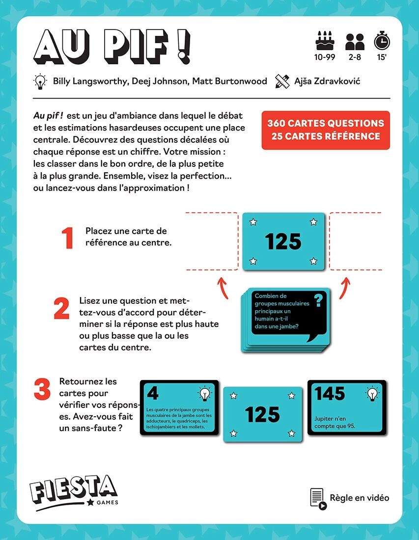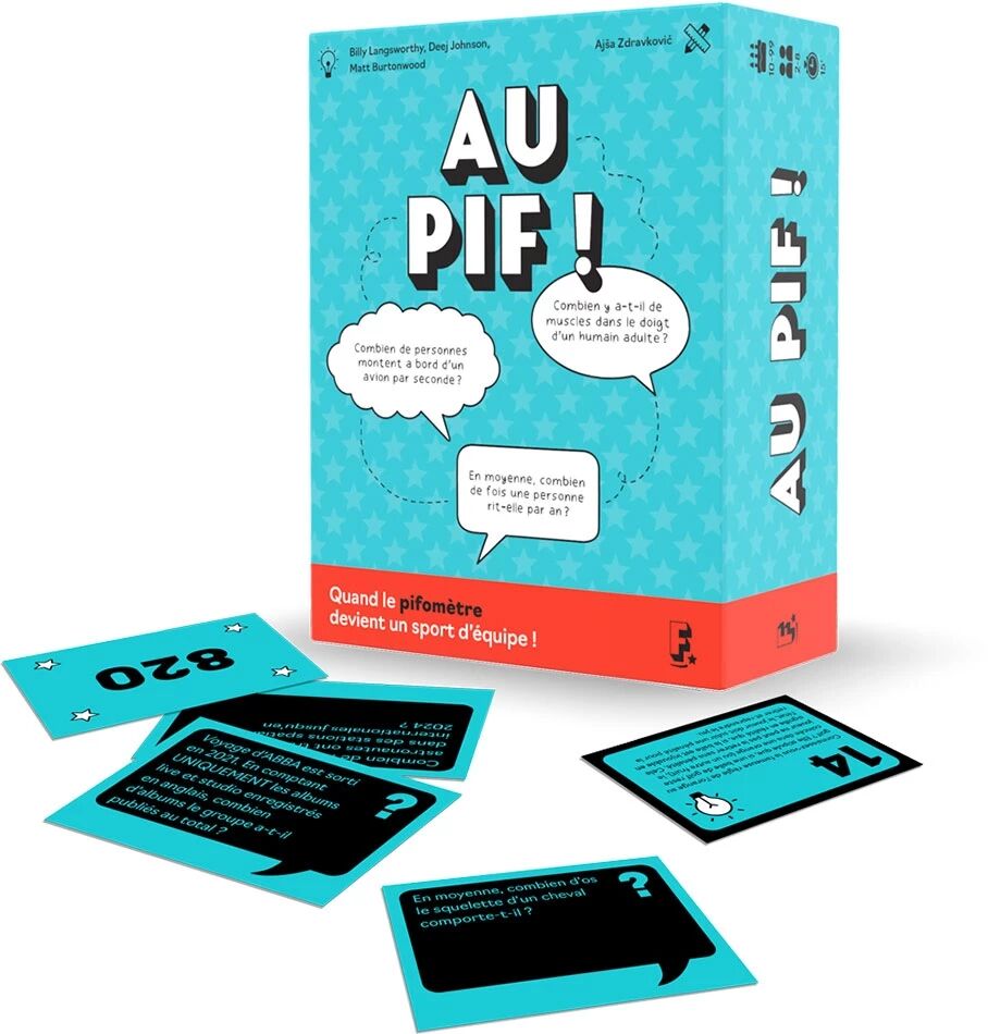 Au Pif ! est un jeu d’ambiance pour 2 à 8 joueurs. Dans ce jeu coopératif, vous devez estimer des réponses chiffrées à des questions souvent surprenantes puis les classer dans le bon ordre. Avoir de la culture ou avoir du pif... Au cours de débats animés, saurez-vous convaincre vos coéquipiers que votre intuition était la bonne ?