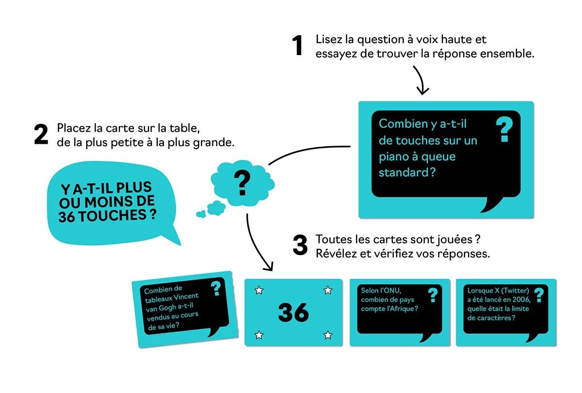 L’objectif est de construire une ligne de cartes classées dans l’ordre croissant, uniquement à partir d’estimations. Les questions couvrent des domaines extrêmement variés : culture générale, sciences, nature, anecdotes historiques ou chiffres insolites. Cette diversité nourrit les échanges et encourage chacun à défendre son point de vue, quitte à se tromper collectivement.