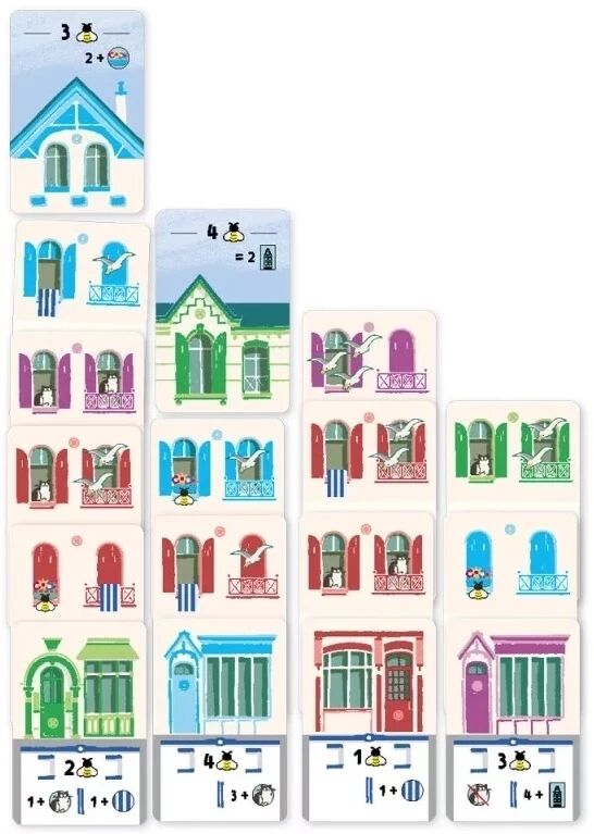 Chaque villa se compose de plusieurs étages : un Rez-de-chaussée, surmonté de Fenêtres, puis d’un Toit. Pour marquer des points, il faudra respecter les conditions de chaque carte, en combinant intelligemment les éléments visibles : chats, mouettes, serviettes ou pots de fleurs. Les Toits apportent des bonus supplémentaires si la construction est bien optimisée, tandis que les groupes de couleurs connectés sur votre front de mer peuvent faire toute la différence au scoring final.