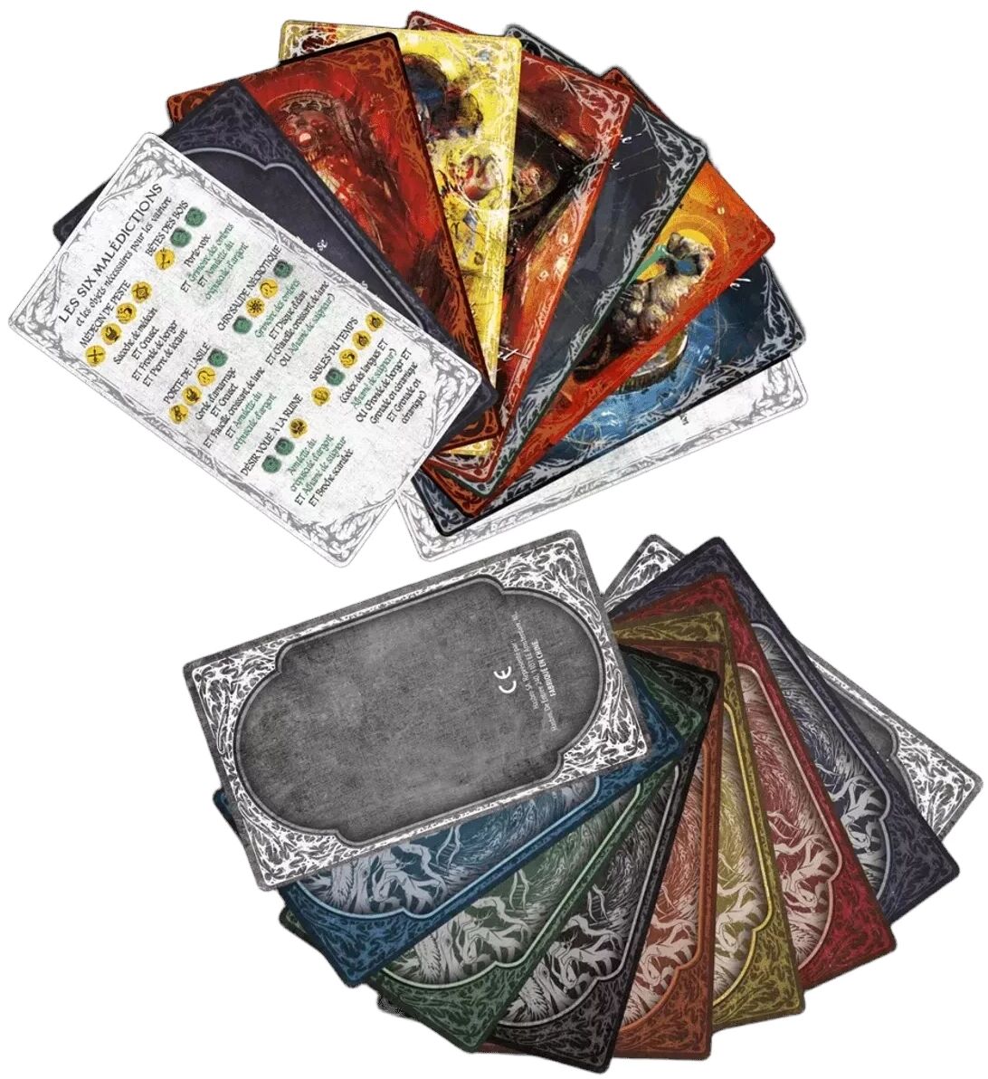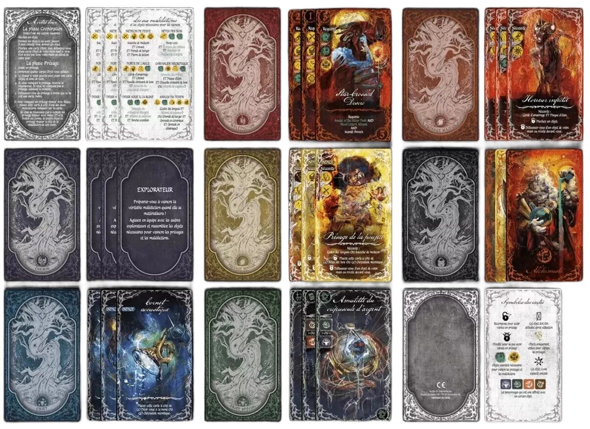 6 cartes Malédiction, 5 cartes Personnage, 6 cartes Chemin, 34 cartes Objet, 4 cartes Objet spécial, 18 cartes Présage mineur, 16 cartes Présage majeur, 5 cartes de référence, 1 carte de référence des symboles, 1 règle du jeu