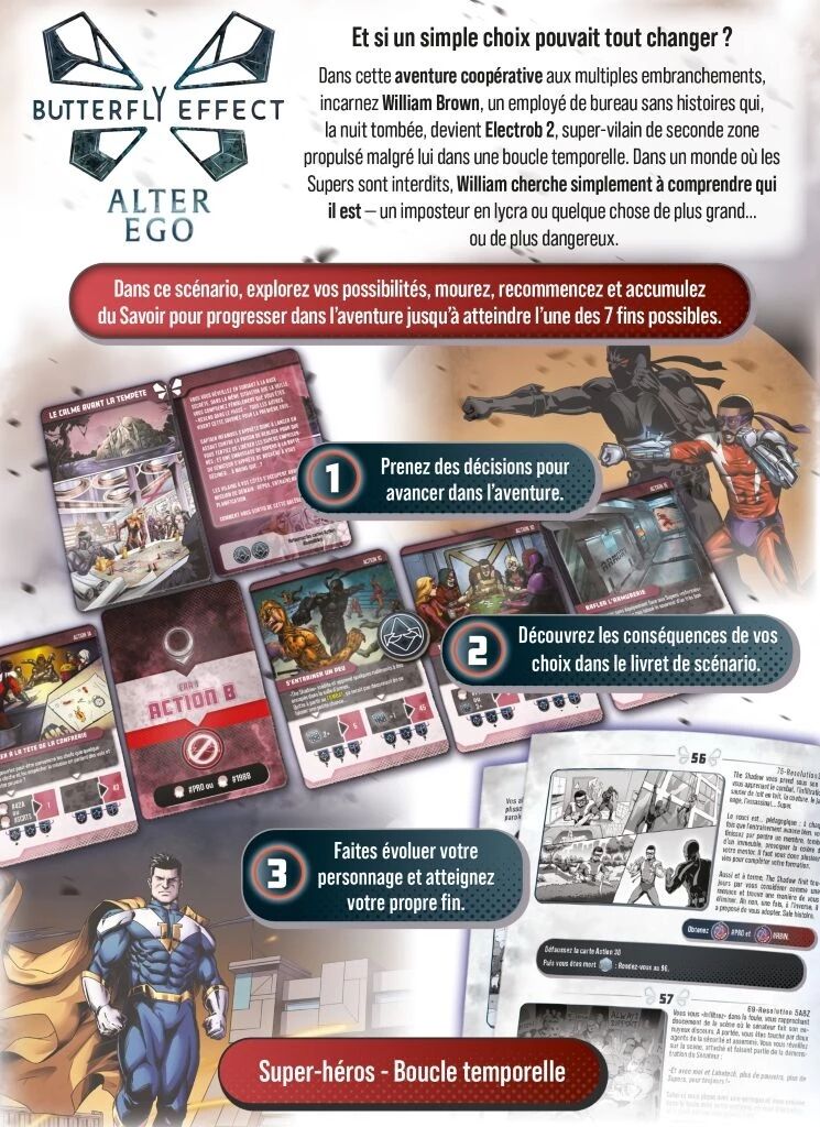 Avec un livret de scénario richement écrit, des références assumées aux comics et une forte rejouabilité grâce à ses multiples embranchements, Butterfly Effect : Alter Ego propose une aventure intense où narration, stratégie collective et exploration se mêlent pour offrir une expérience unique à chaque partie.