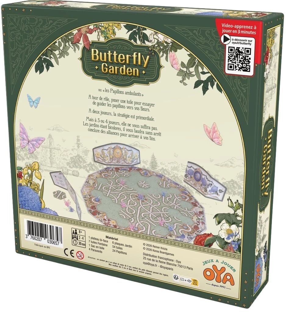1 plateau, 1 sac, 4 paravents, 54 tuiles chemin, 7 tuiles fontaine, 24 papillons, 24 jetons joueur, 1 règle du jeu (imprimée sur le rabat de la boîte).