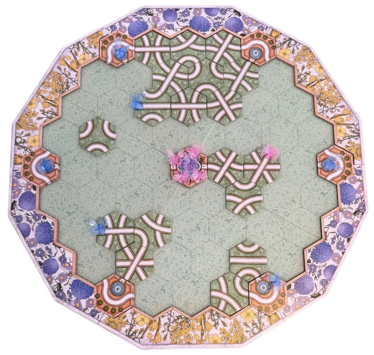 À chaque tour, un joueur place une tuile Chemin sur le plateau. Si celle-ci prolonge un parcours existant, les papillons avancent automatiquement jusqu’au bout de la route. Lorsqu’ils atteignent un jardin, leur propriétaire les récupère et marquera des points en fin de partie. Les papillons bleus rapportent 1 point, les roses 2 points et le papillon violet 3 points : il faudra parfois accepter de petits gains pour préparer des opportunités plus lucratives.