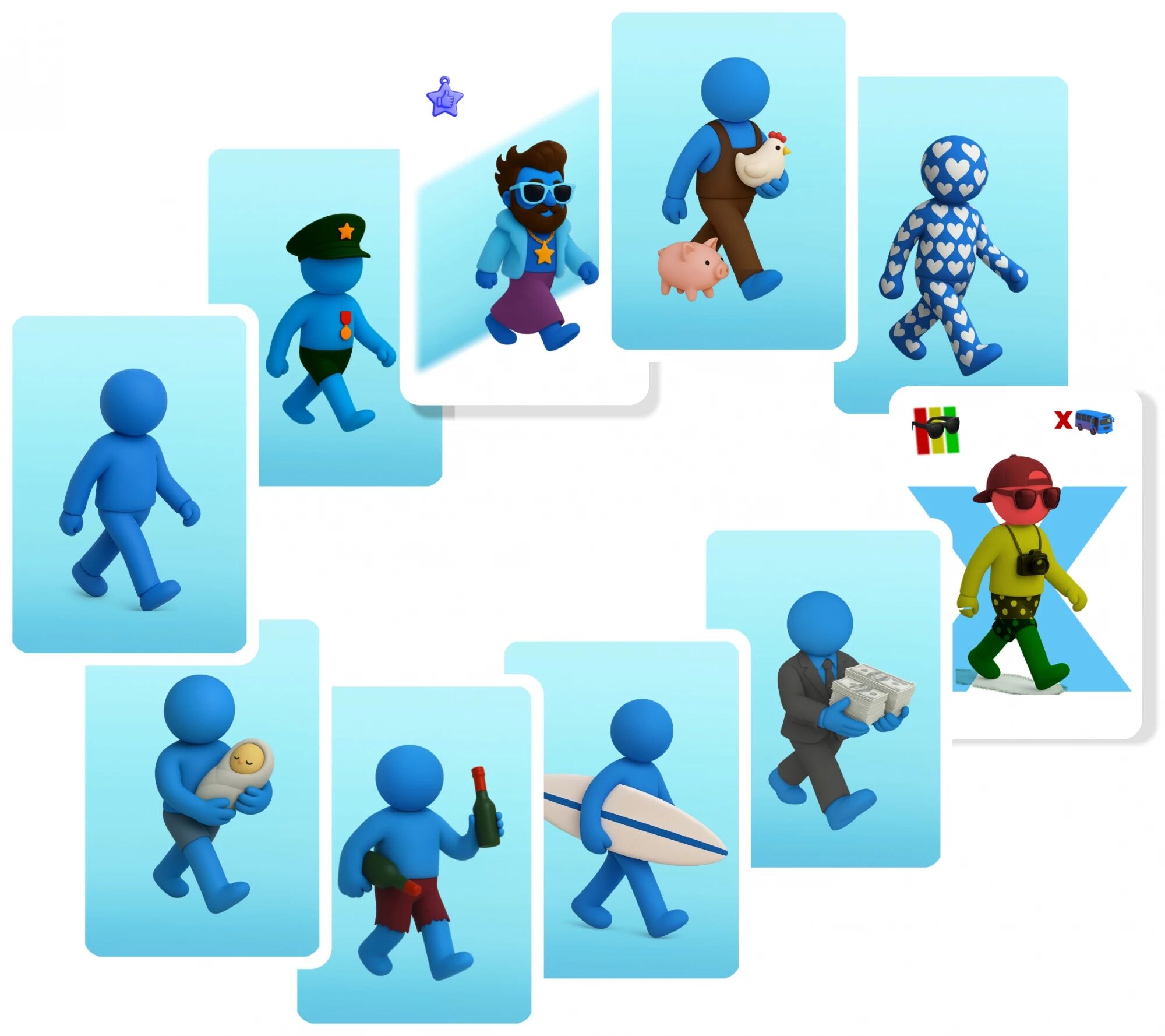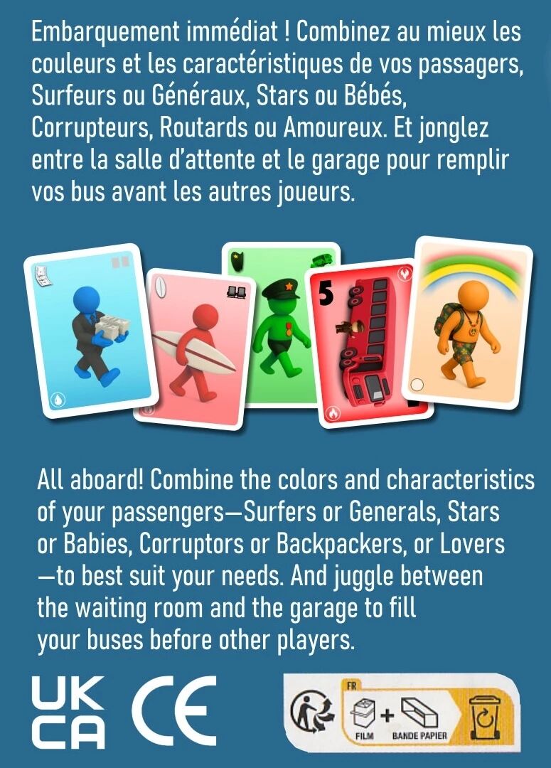 Entre le Surfer qui prend deux places, le Général qui réquisitionne le bus et mécontente tout le monde, les Amoureux qui refusent d’être séparés, ou encore la Star qui change la couleur du bus en cours de route, chaque embarquement devient un véritable casse-tête. Il faut gérer la salle d’attente commune, anticiper les actions adverses et choisir le bon moment pour compléter un bus. Car seul le joueur qui remplit totalement le bus récupère les passagers transportés !
