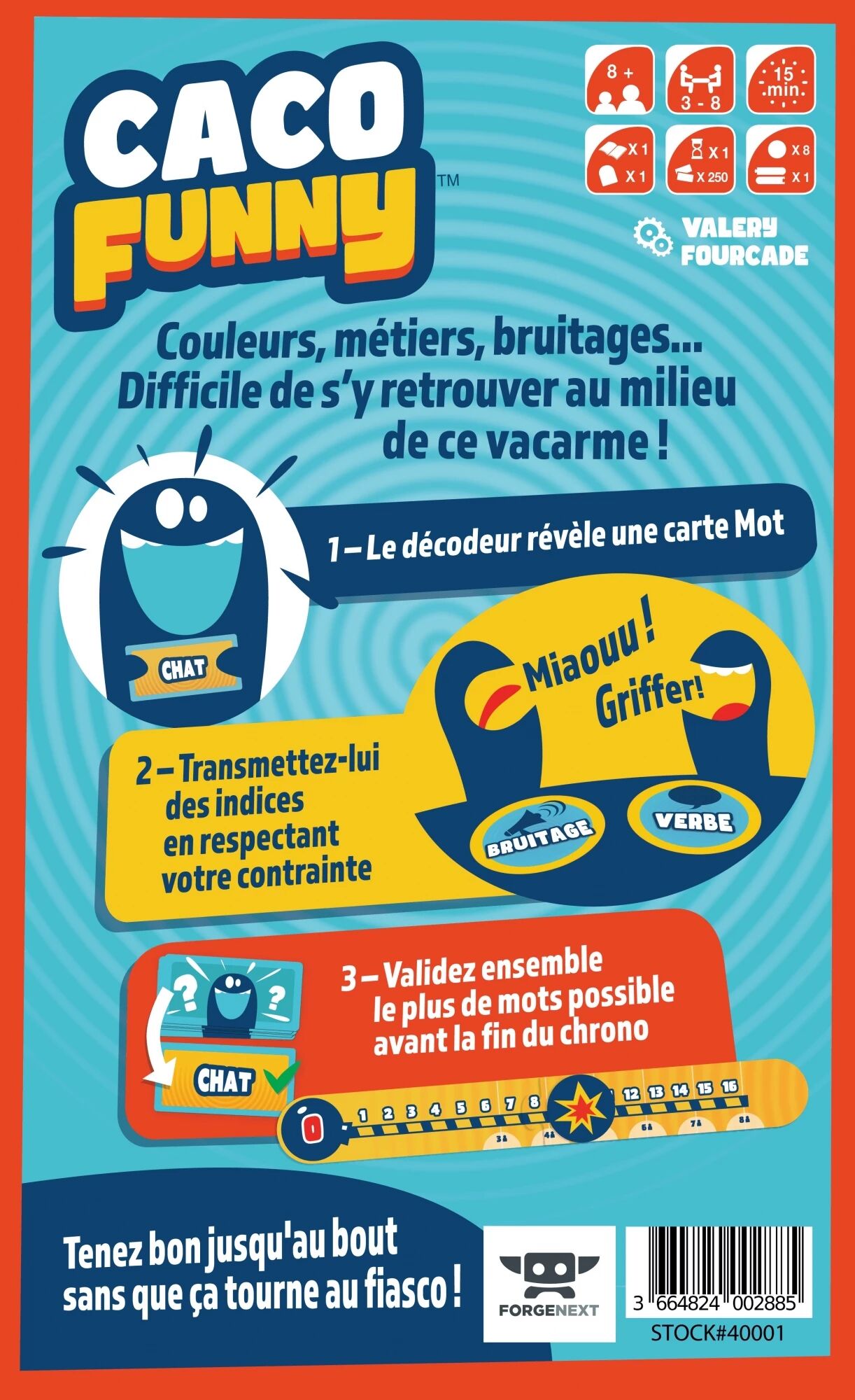 Mais dans Caco Funny, rien n’est simple : chaque Informateur doit respecter une contrainte spécifique qui transforme totalement sa manière de communiquer. Bruitages improbables, catégories imposées, types d’indices limités… tout est fait pour brouiller les pistes et créer une joyeuse confusion autour de la table. Résultat : tout le monde parle en même temps, les idées s’entrechoquent… et le Décodeur doit garder la tête froide pour s’y retrouver.