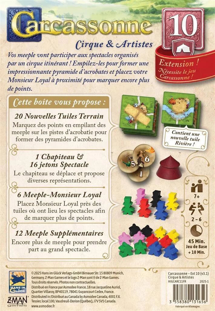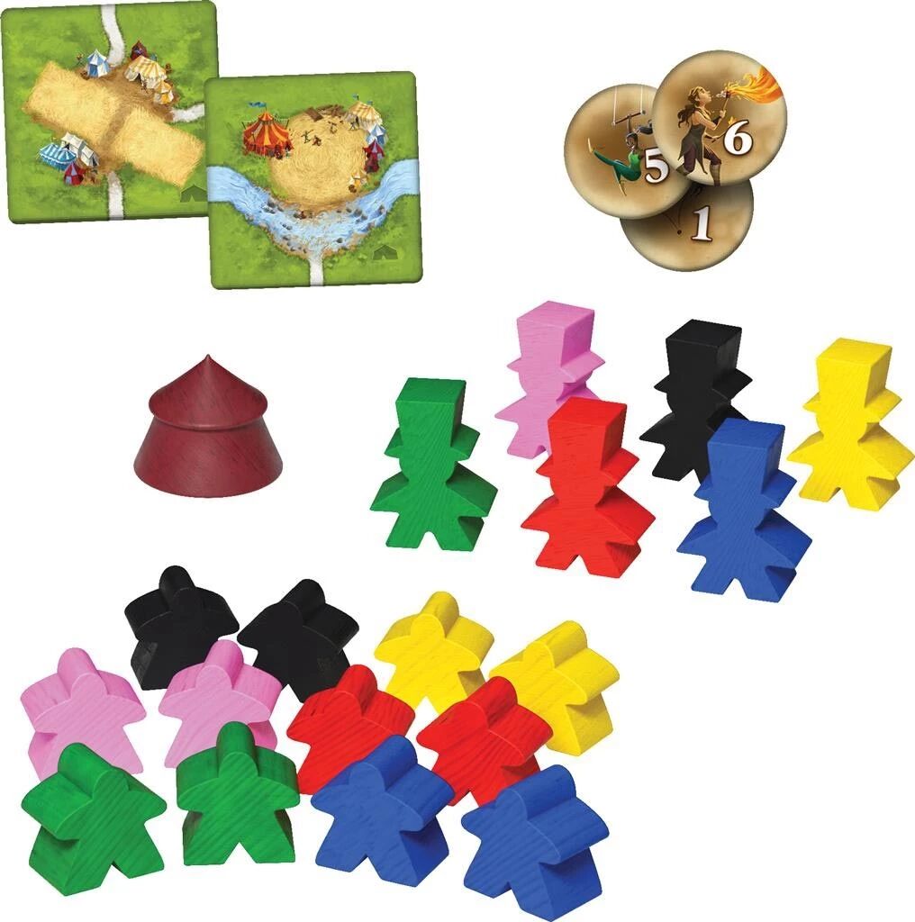 Avec l'extension Cirque & Artistes, vos meeples deviennent des artistes de cirque, prêts à se produire en ville, sur les routes ou les prés pour divertir la population… et vous faire marquer toujours plus de points ! Cette extension amusante repose sur deux mécaniques originales. D’abord, les tuiles Acrobatie vous permettent d’empiler vos meeples pour former une pyramide humaine.