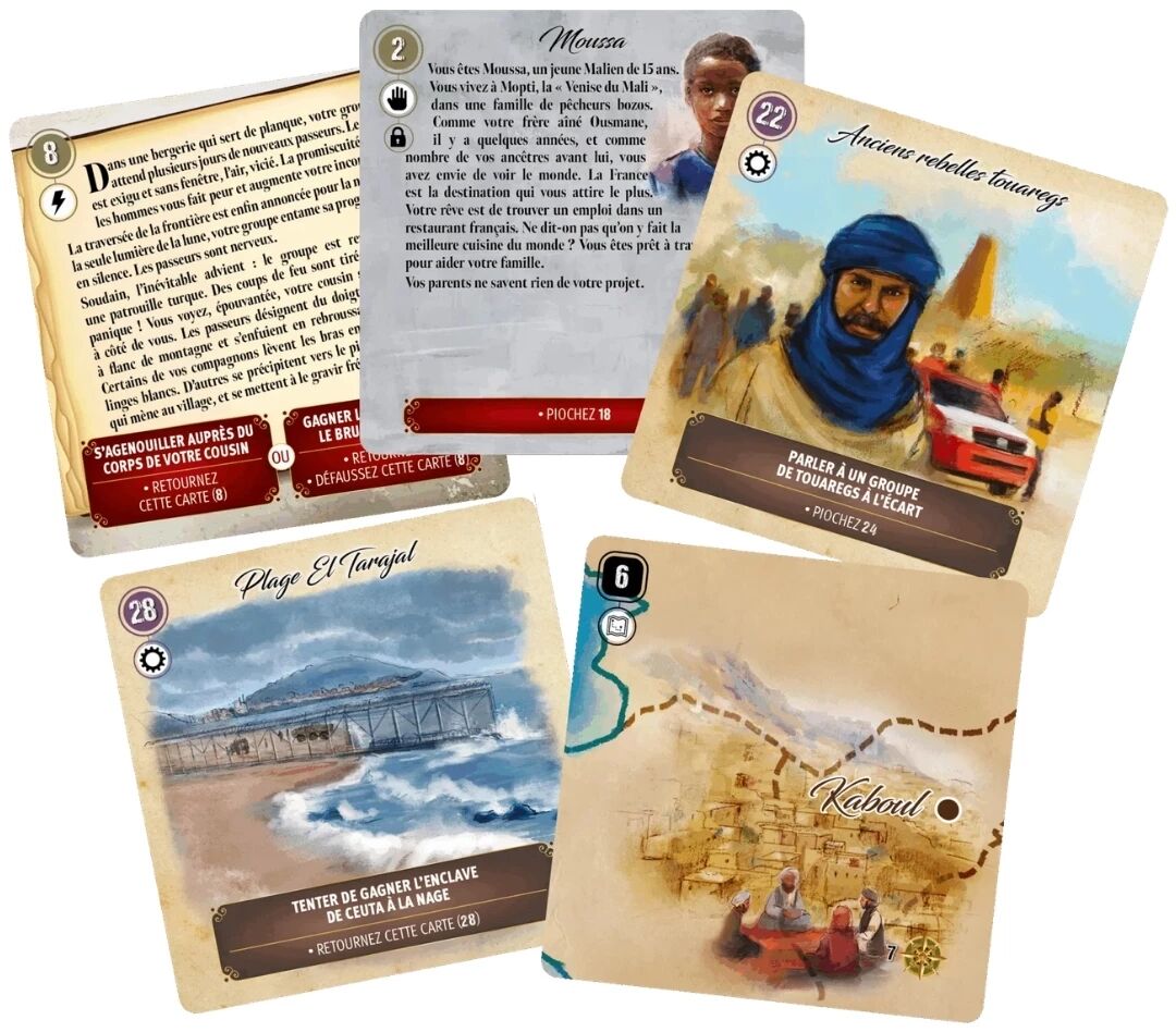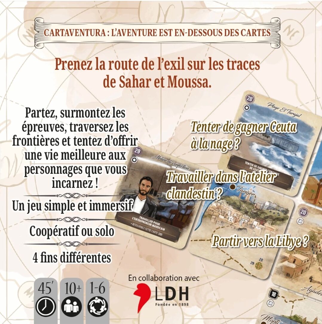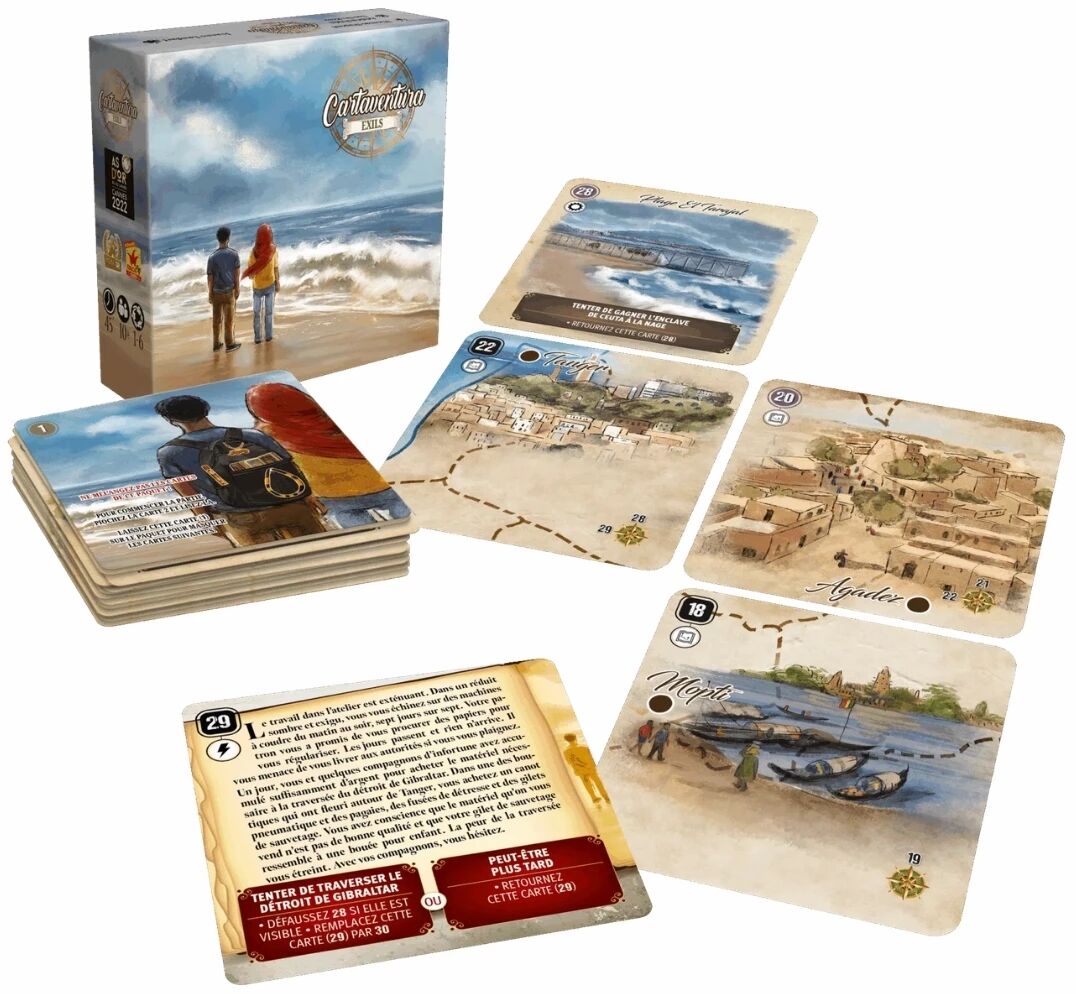 La mécanique de Cartaventura : Exils est très simple à appréhender : révélez des cartes, lisez le contexte, puis choisissez votre action parmi plusieurs options. Ce système favorise l’immersion et incite à rejouer l’aventure afin de découvrir tous les embranchements narratifs possibles. Grâce à ses illustrations soignées et ses deux histoires rédigées en partenariat avec la Ligue des Droits de l’Homme, Cartaventura : Exils vous propose de vivre une aventure une aventure historique forte, immersive et profondément engagée.