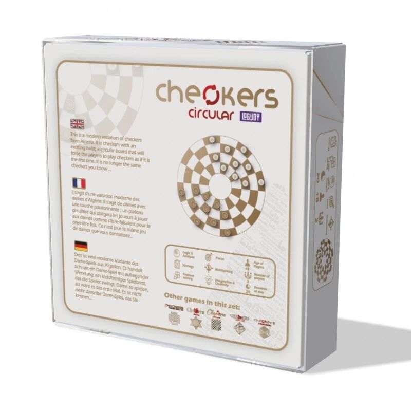 Checkers Circular conserve la simplicité et l’élégance du jeu de dames tout en apportant un matériel original et un twist stratégique ingénieux. Il plaira aux amateurs du jeu classique qui souhaitent découvrir de nouvelles façons d'appréhender les dames, avec une réflexion renouvelée à chaque duel.