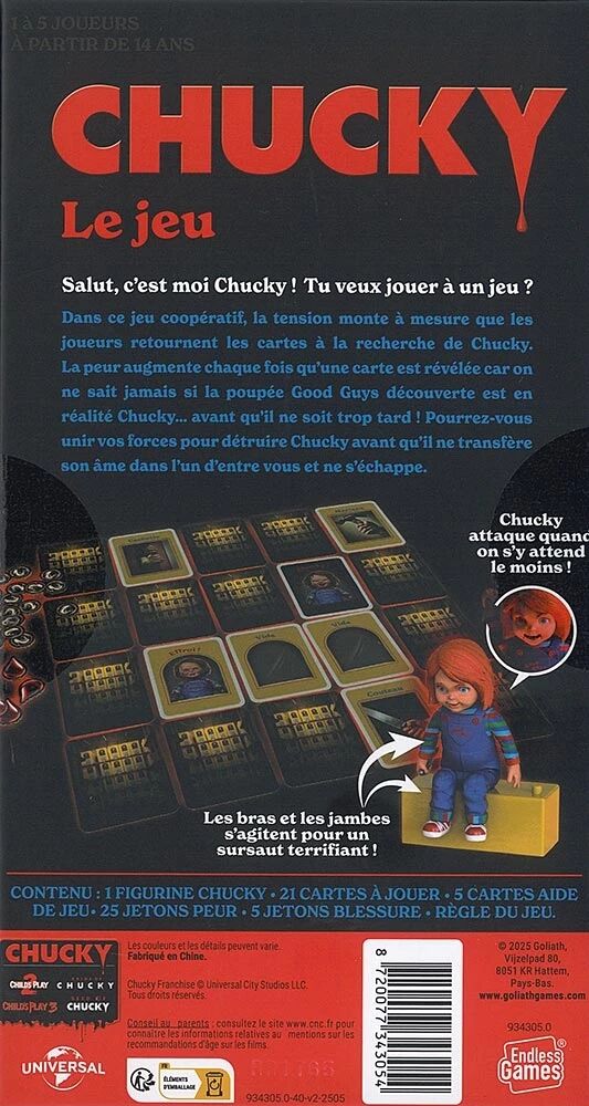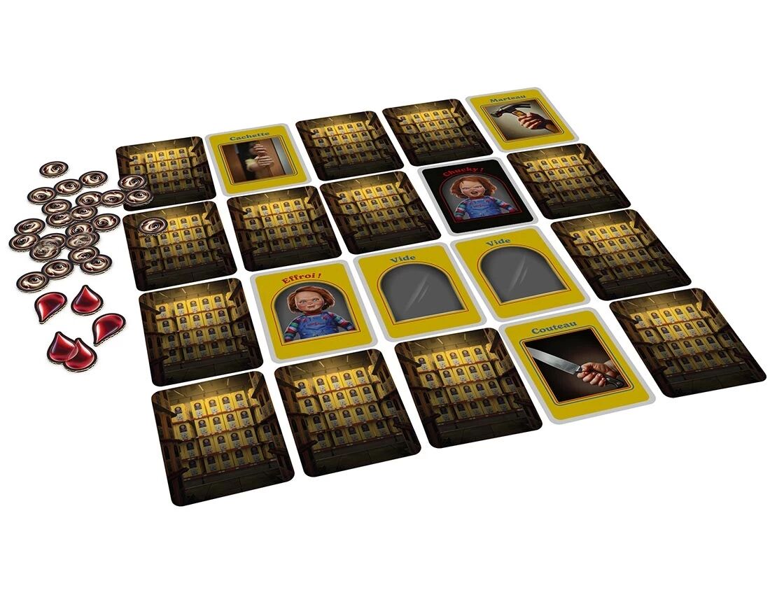Cartes de jeu, Jetons peur, Jetons blessures, Figurine de Chucky, règles du jeu