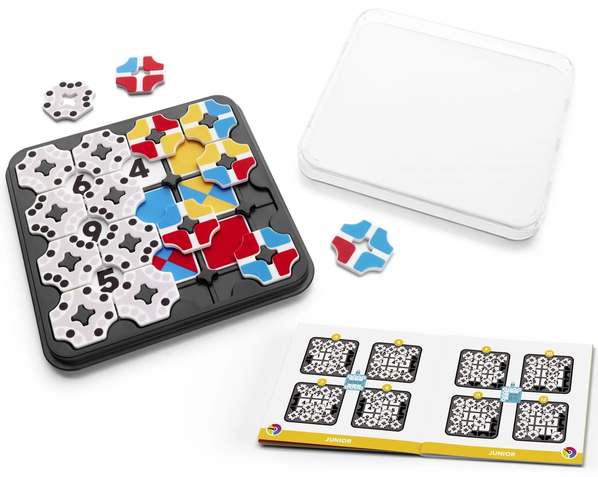 1 plateau de jeu, 9 tuiles carrées recto-verso "chiffre" ou "couleur", 16 tuiles avec encoche recto-verso de couleur ou avec des points, 1 livret de 60 défis avec les solutions.