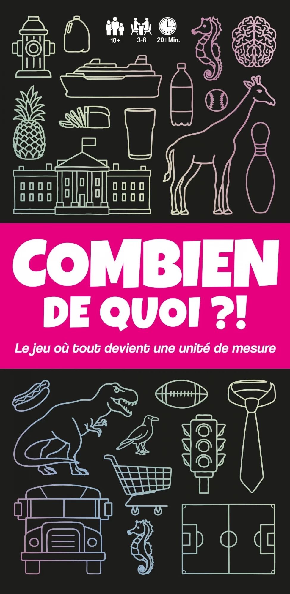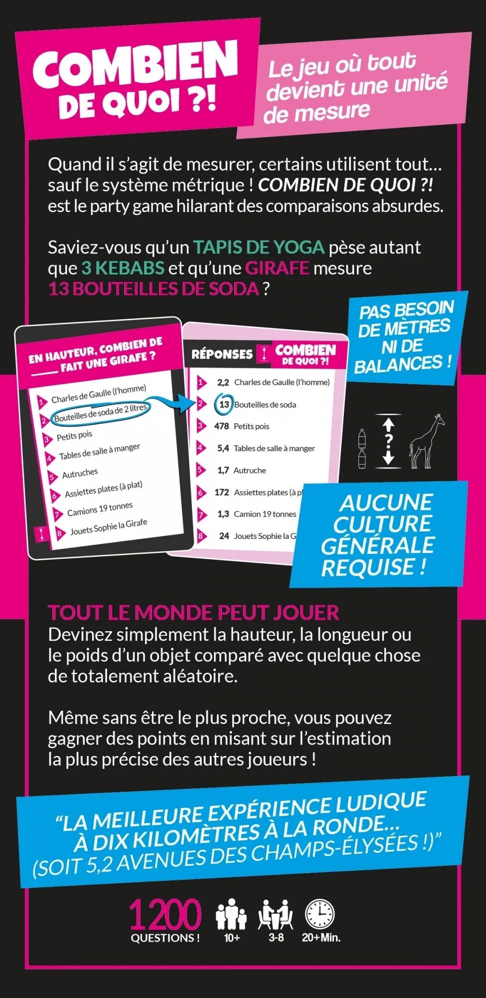 Le jeu Combien de quoi ?! transforme les mesures du quotidien en unités loufoques pour comparer tout et n'importe quoi. Ici, pas besoin de maîtriser les mètres, les kilos ou les centimètres : tout devient prétexte à comparaison farfelue. Une girafe en bouteilles de soda, une piste de bowling en bananes, un lingot d’or en objets totalement improbables… il n'y a aucune limite à votre imagination !