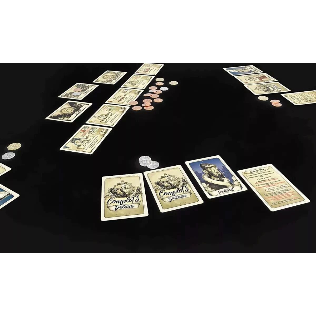 Dans le jeu Complots, vous disposez en secret de l'aide de deux personnages et par la ruse et le bluff, vous n'aurez qu'une obsession: éliminer tous les autres de votre chemin.