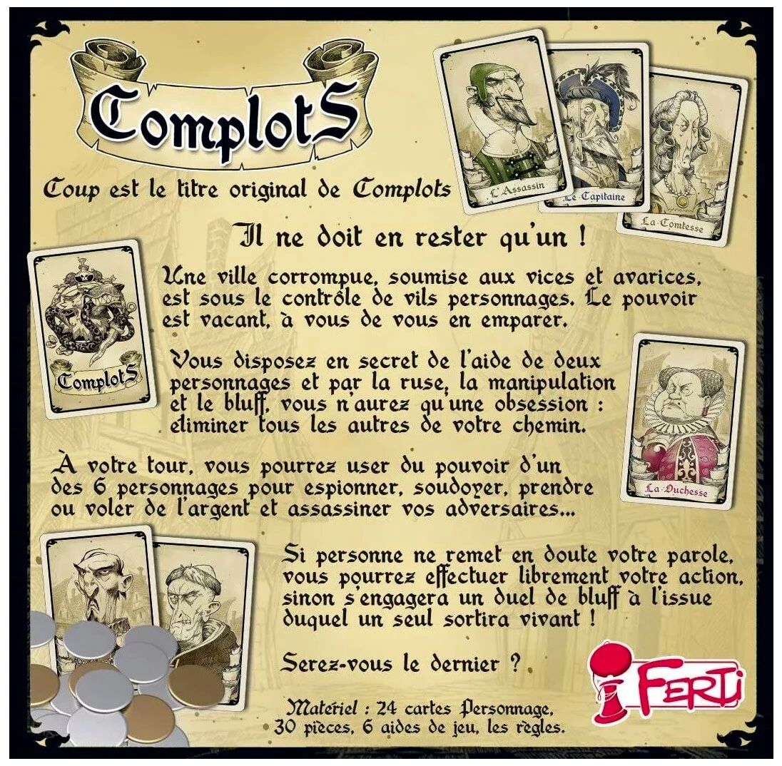 Complots est la réédition du jeu nommé "Coup" avec des illustrations signées Naïade, un nouveau personnage, l'inquisiteur et des règles spéciales pour jouer à deux. Il ne doit en rester qu'un ! Serez vous le dernier ?