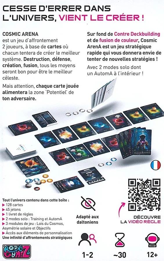 Dans le jeu Cosmic Arena, chaque joueur dispose de 3 jetons Pouvoir, qu’il utilise pour réaliser différentes actions : créer des planètes, fusionner deux planètes pour en obtenir une plus puissante, jouer des cartes d’attaque ou de défense, ou encore manipuler le deck potentiel de l’adversaire.