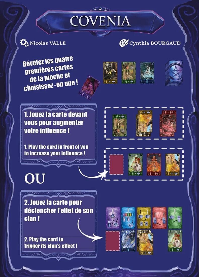 Covenia est un jeu accessible, nerveux et malin, dans un univers fort porté par des héroïnes charismatiques. Il repose sur un équilibre subtil entre développement de vos clans et interaction directe, en agissant sur l'aire de jeu adverse grâce, notamment, aux Rituels.