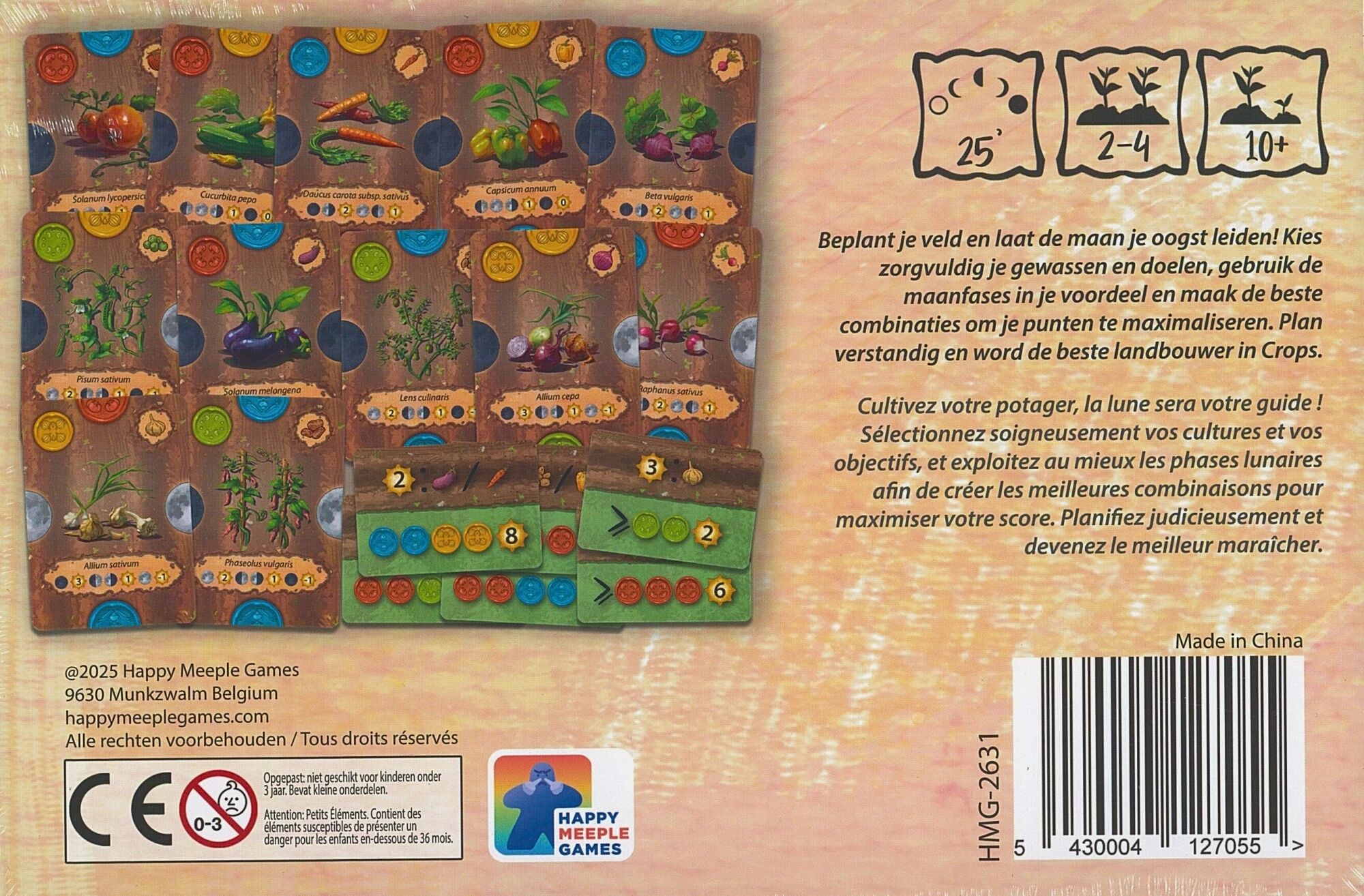 Toute l'originalité de Crops réside dans l’influence des phases lunaires. Celles-ci vont orienter votre stratégie et déterminer une partie de votre score final. Vous devrez donc anticiper quelle phase sera dominante dans votre champ et adapter vos choix en conséquence. Votre score final repose sur plusieurs axes : la phase lunaire majoritaire, les symboles de familles de cultures, ainsi que les objectifs placés dans votre champ. Cette diversité encourage des approches variées et des stratégies multiples au fil des parties.