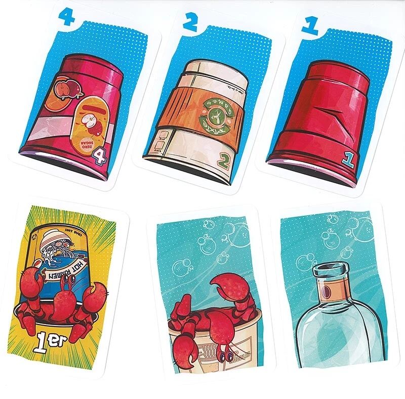 Mais attention, tout n’est pas qu’une simple question de valeur : le cœur du jeu repose sur l’utilisation intelligente des cartes spéciales. Les cartes Crabe et Poulpe permettent de s’emparer immédiatement d’une pile, tandis que les cartes Bouteille viennent perturber la table en bloquant une pile et en la rendant accessible uniquement à certaines actions. Cette mécanique, au cœur du jeu, vous oblige à surveiller chaque opportunité tout en empêchant vos adversaires de récupérer les piles les plus lucratives.