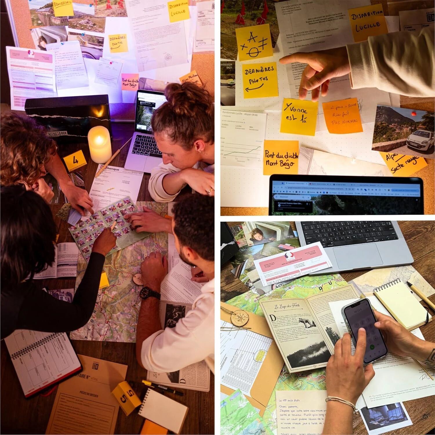 Tous les éléments nécessaires à l'enquête : indices physiques (rapports, pièces à conviction), journaux/carnet crypté, photos, documents divers, audio/vidéos interactifs sur une plateforme numérique, accès à des contenus multimédias.
