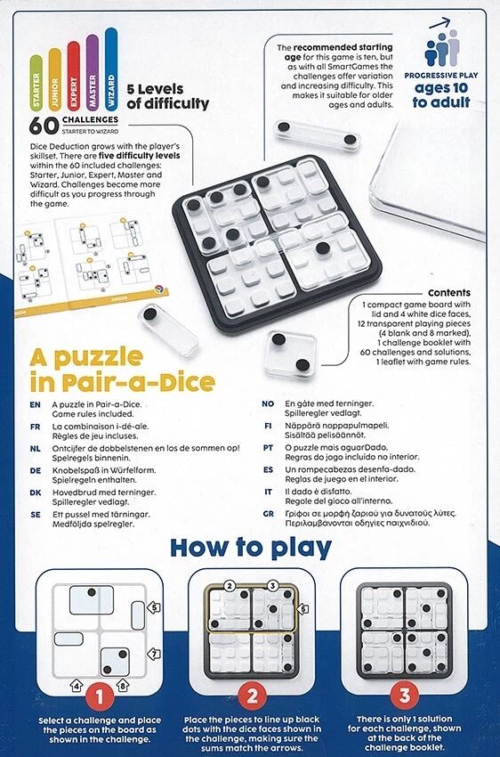 Positionne stratégiquement chaque pièce pour aligner les points noirs avec les faces de dés indiquées dans les défis, en veillant à ce que les sommes correspondent aux flèches. Chaque défi n’ayant qu’une seule solution, tu enchaîneras les réussites en assemblant ces casse-têtes qui font chauffer les méninges.