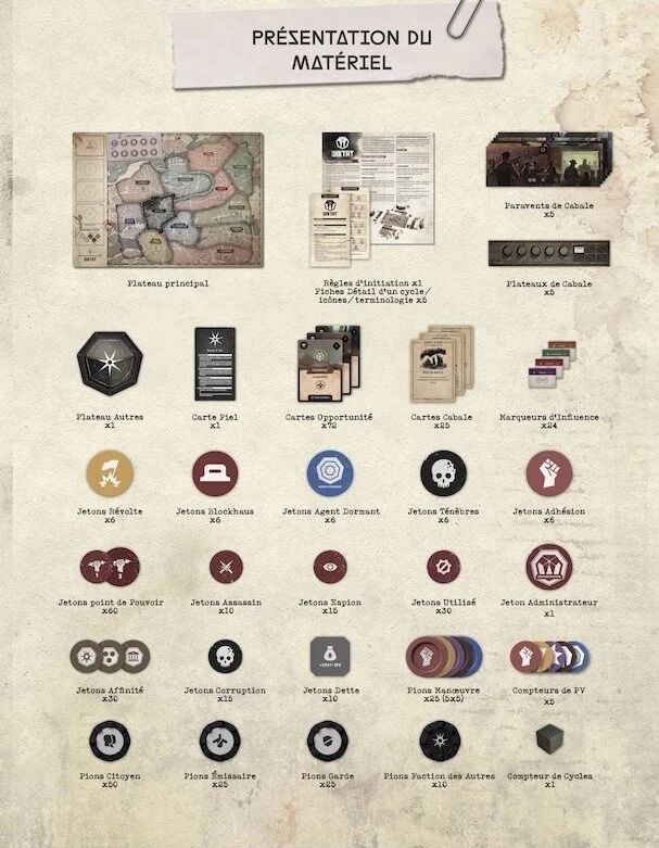 1 plateau de jeu, 72 cartes Opportunité, 100 pions Agents (50 Citoyens, 25 Gardes, 25 Émissaires), 10 jetons Assassin, 15 jetons Espion, 24 marqueurs d’Influence (2 par secteur), 30 jetons Affinité (10 Politique, 10 Peuple, 10 Artefact), 30 jetons Utilisé, 5 plateaux de Cabale, 5 paravents, 5 compteurs de Points de Victoire, 25 cartes Cabale, 25 pions Manoeuvre, 1 jeton Administrateur, 1 compteur de Cycles, 6 jetons Agent dormant, 6 jetons Adhésion, 6 jetons Révolte, 6 jetons Blockhaus, jetons Points de Pouvoir, jetons Dette, 1 livre de règles, aides de jeu (détail d’un cycle, lexique des icônes, terminologie, détail des marqueurs d’Influence), 1 feuillet de règles d’initiation