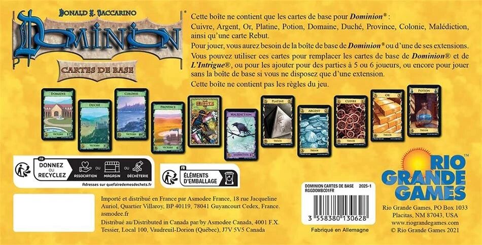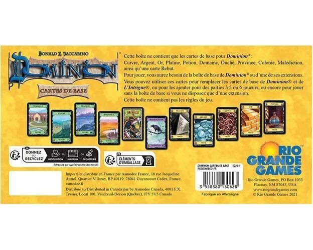 Cette boîte ne contient que les cartes de base pour joueur à Dominion : Cuivre, Argent, Or, Platine, Potion, Domaine, Duché, Province, Colonie, Malédiction, ainsi qu’une carte Rebut.