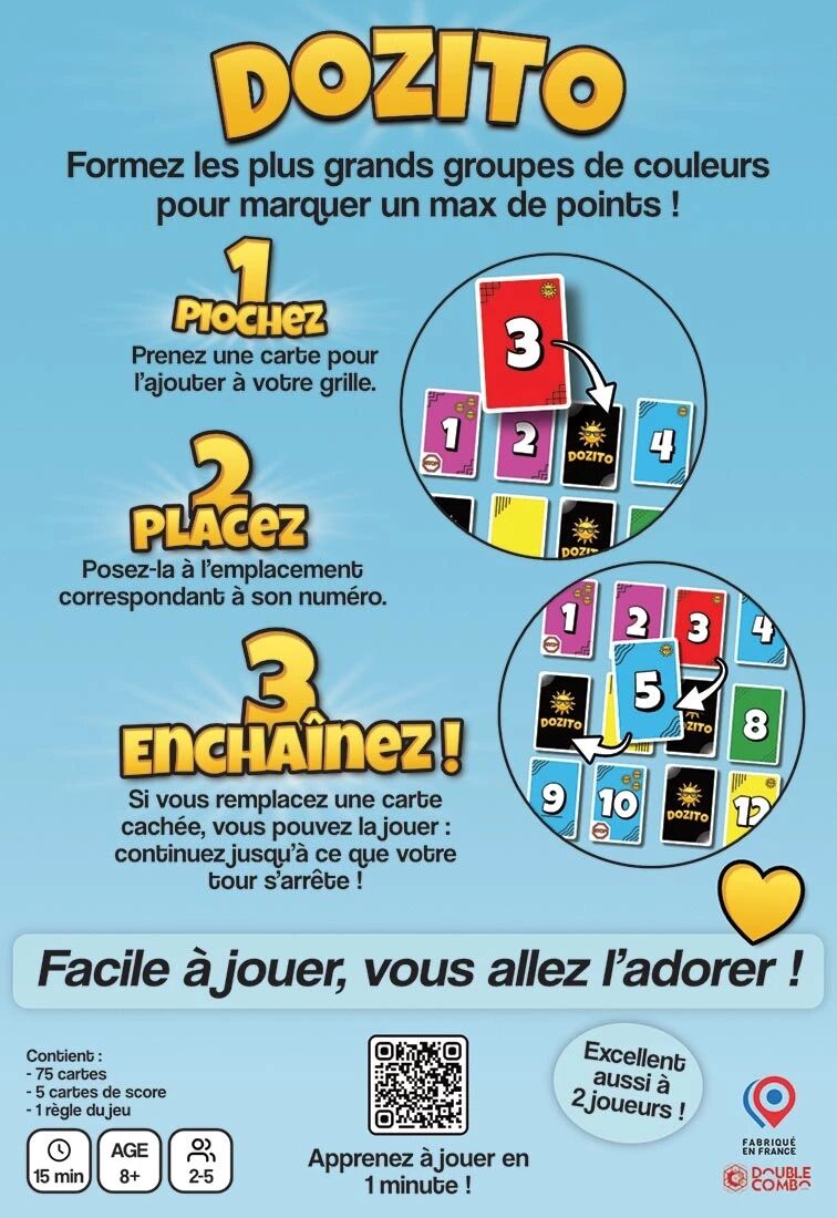 Douze emplacements, des cartes qui n’attendent qu’à être révélées… et toujours ce petit moment d’hésitation avant de poser la suivante. Dans Dozito, chaque numéro a sa place, mais pas forcément l’effet attendu. Une carte en cache une autre, qui en déclenche une troisième, et soudain votre tour s’emballe… ou s’arrête net !