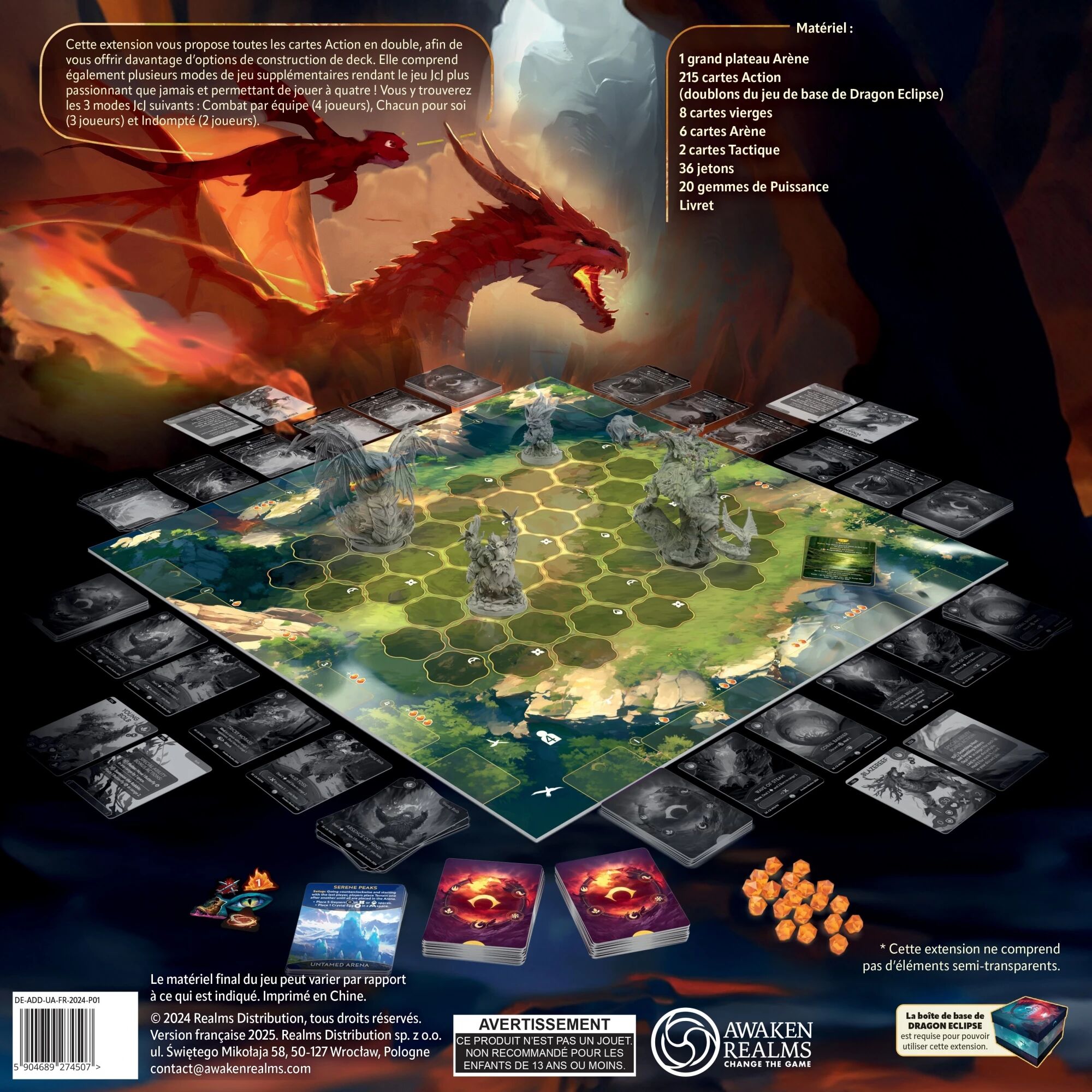 Avec l'extension L'Arène des Indomptés (Untamed Arena) pour le jeu Dragon Eclipse, l’expérience se recentre sur l’affrontement direct entre deux joueurs. Cette extension introduit un mode arène qui met en avant la maîtrise de votre deck et votre capacité à analyser et contrer le jeu adverse.