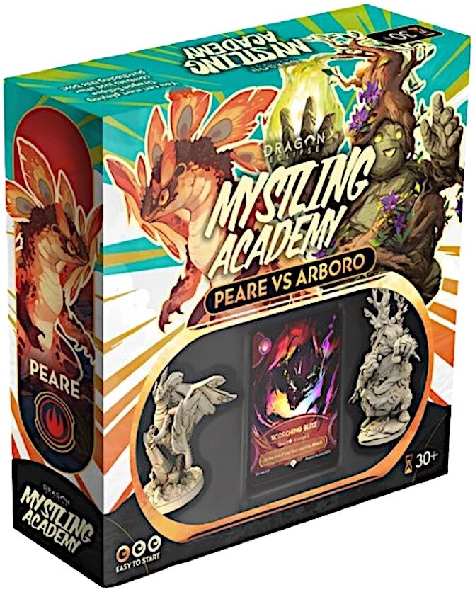 Dragon Eclipse : Mystling Academy - Peare VS Arboro est une boîte autonome (standalone) dans l’univers de Dragon Eclipse. Ce set “Open & Play” propose deux Mystlings aux styles radicalement différents : Arboro, créature tellurique résiliente et tactique, et Peare, dragon fougueux spécialisé dans les attaques explosives. La mécanique de jeu est centrée sur des affrontements PvP (Joueur contre Joueur) rapides et nerveux au sein d'une arène.