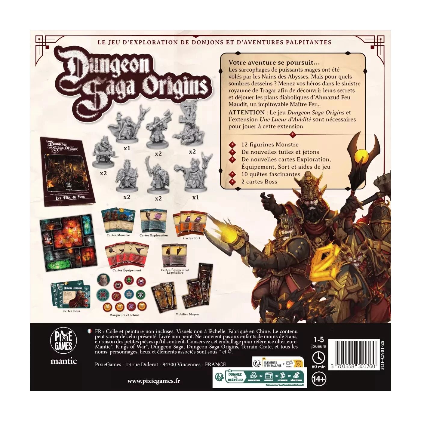 12 figurines Monstre, nouvelles tuiles, jetons, cartes Exploration, cartes Équipement, cartes Sort, aides de jeu, 10 quêtes, 2 cartes Boss