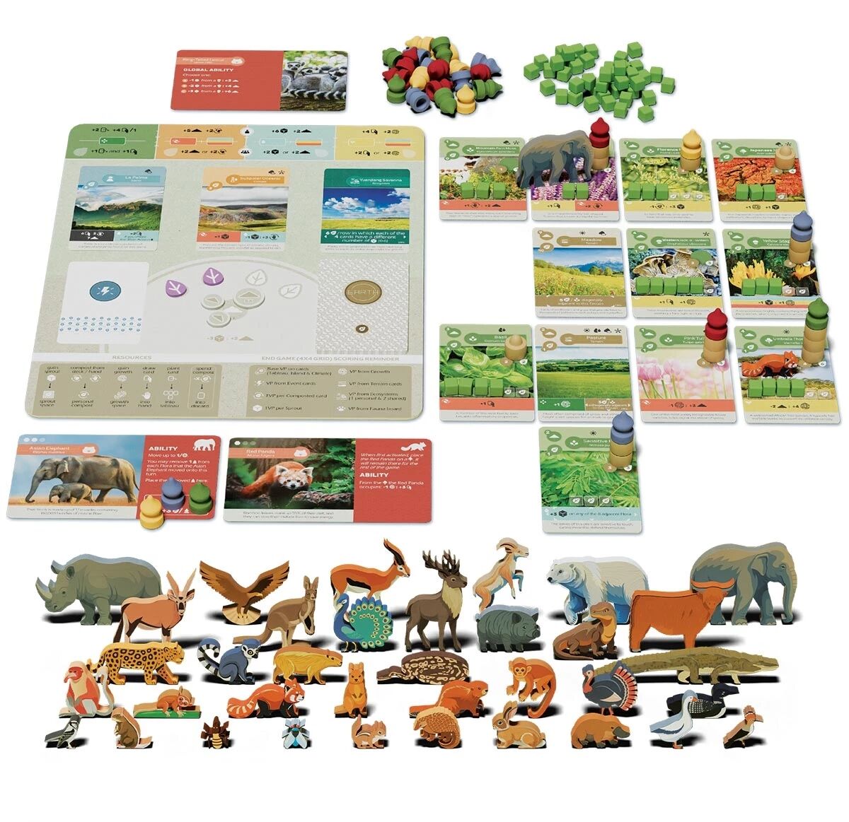 1 livret de règles, 36 cartes Animal recto verso, 56 pions Animal (de 36 formes différentes), 50 cubes Germe, 20 pions Canopée, 1 bloc de score