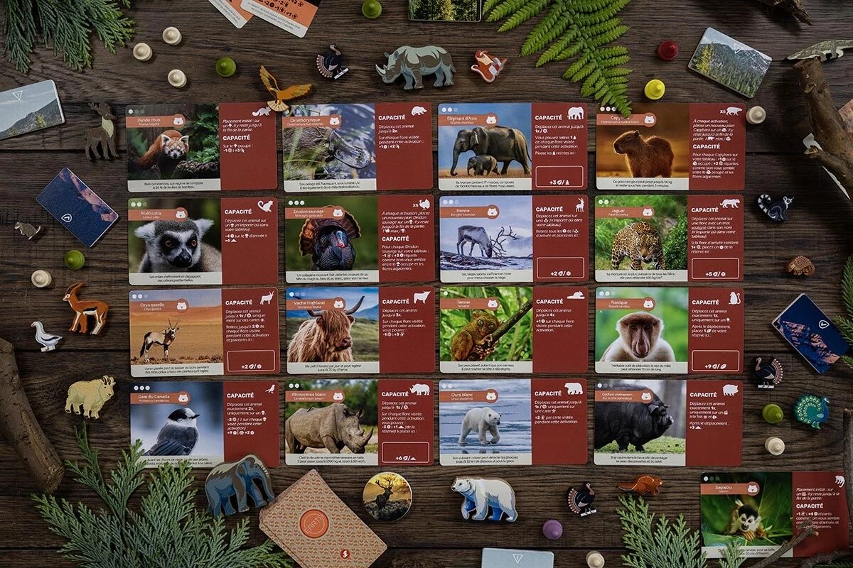 Continuez de créer votre île, un tableau de 16 cartes, en y ajoutant 36 cartes Animal et les 56 magnifiques pions qui s’y rapportent. Ceux-ci apportent de l’asymétrie entre les joueurs avec les capacités individuelles mais également du renouvellement dans vos parties grâce à la capacité collective de l’animal choisi. Un émerveillement et une profondeur inégalés !