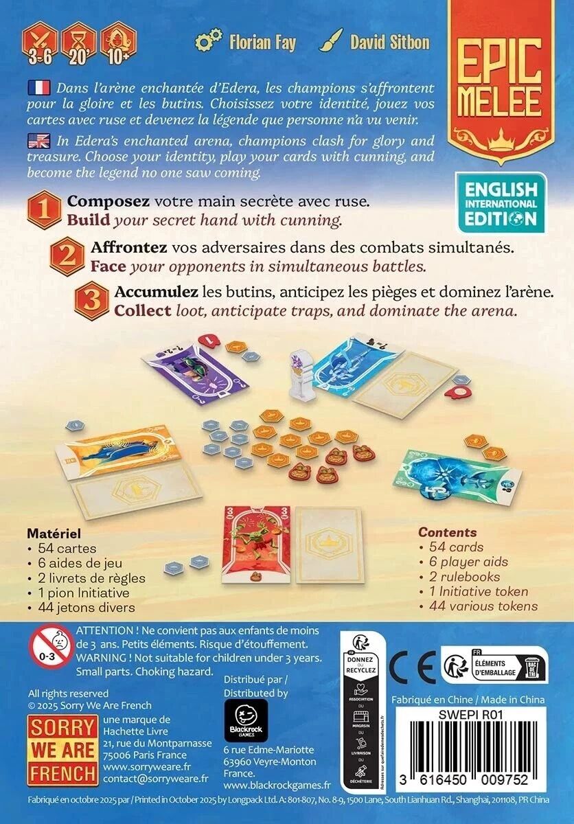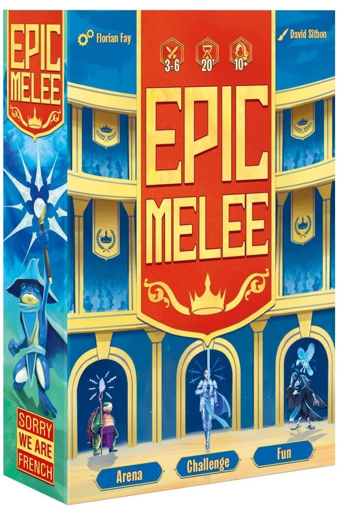 Dans le jeu Epic Melee, chaque joueur dirige une équipe de combattants hétéroclites : chevaliers valeureux, grenouilles invocatrices, gobelins explosifs, corbeaux enragés, tortues stratèges, golems rusés et même un visiteur violet capable de déformer la réalité… Au fil des six rondes de combat, les talents s’activent et l’arène réserve bien des surprises. L’équipe ayant accumulé le plus de butins à la fin des six combats l’emporte.
