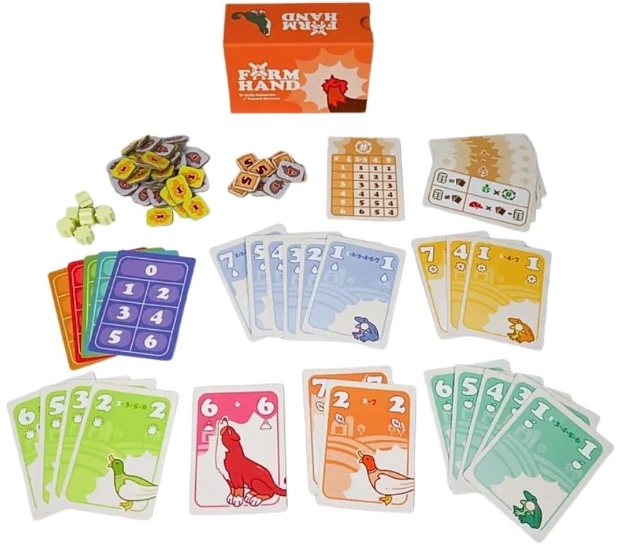Dans le jeu Farm Hand, les joueurs participent à un étonnant concours de bruit entre animaux de la ferme. À chaque manche, tous reçoivent un nombre précis de cartes Animal, réparties en six couleurs, chacune possédant sa propre distribution de valeurs. Particularité majeure : les cartes sont tenues de façon à ce que leurs dos – indiquant la couleur et les valeurs possibles – soient visibles par les adversaires, tandis que les valeurs exactes restent secrètes.
