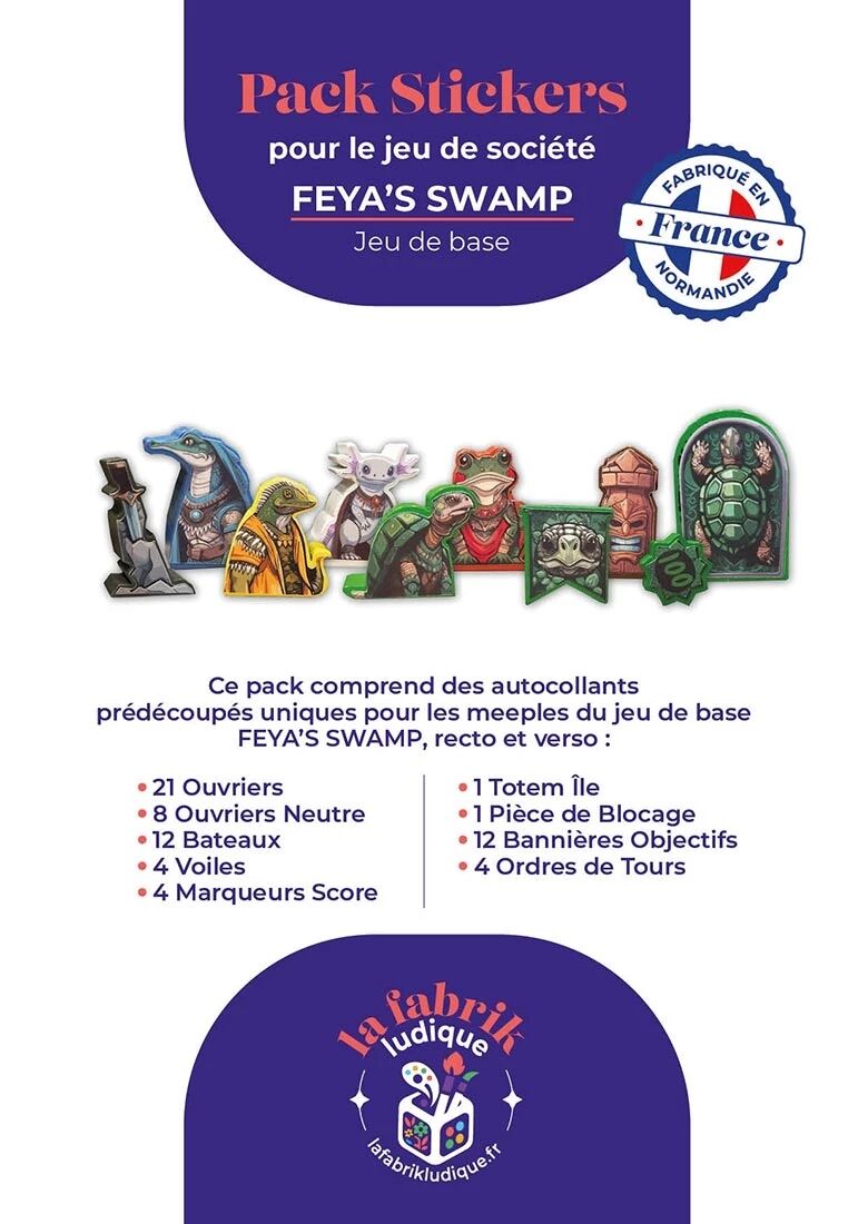 Ajoutez du style et de la lisibilité à vos parties de Feya's Swamp grâce à ce pack de stickers conçu pour le jeu ! Chaque autocollant vient embellir les pions en bois pour une immersion renforcée.