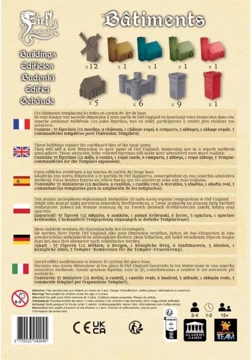 Le Pack Bâtiments pour le jeu de société Fief England comprend 37 bâtiments qui viennent remplacer les tuiles en carton du jeu de base.