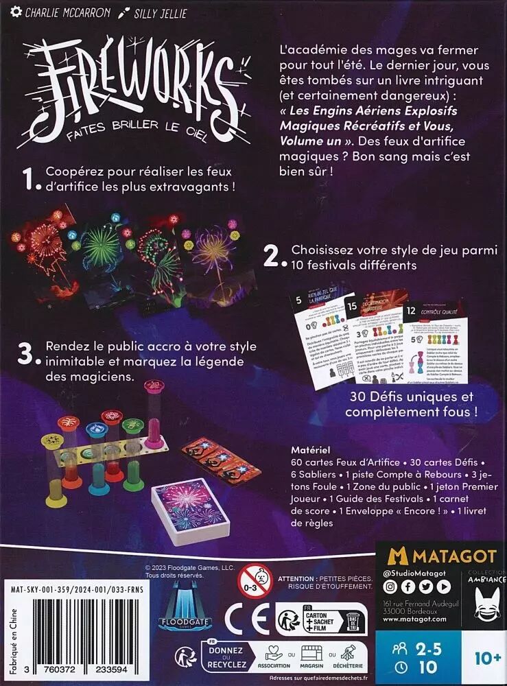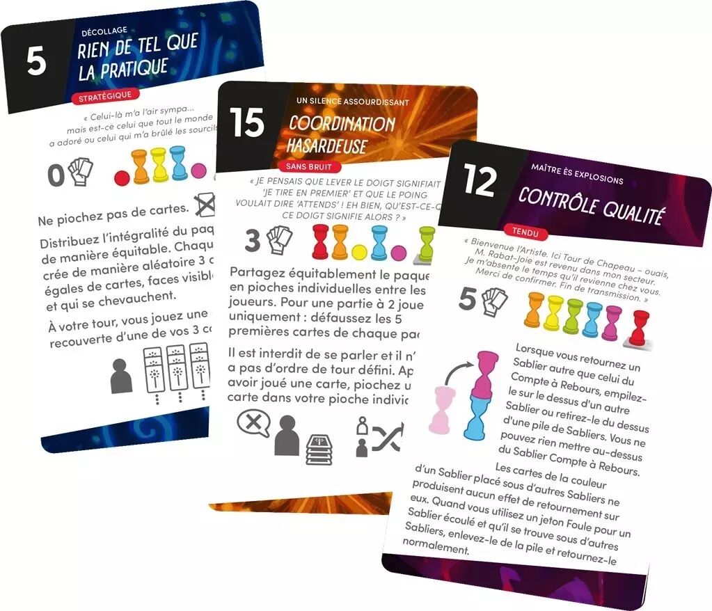 Dans le jeu Fireworks, vous jouez de concert pour réaliser des spectacles de feux d'artifice inoubliables, en jouant des cartes Feux d'Artifice et en retournant des sabliers assortis. Utilisez votre sens du timing, votre stratégie et votre instinct de groupe pour faire avancer le compte à rebours, tout en gardant les autres sabliers en marche. Vous gagnez lorsque le sablier de compte à rebours atteint la fin de la piste, en évitant que trop de sabliers ne s'épuisent.