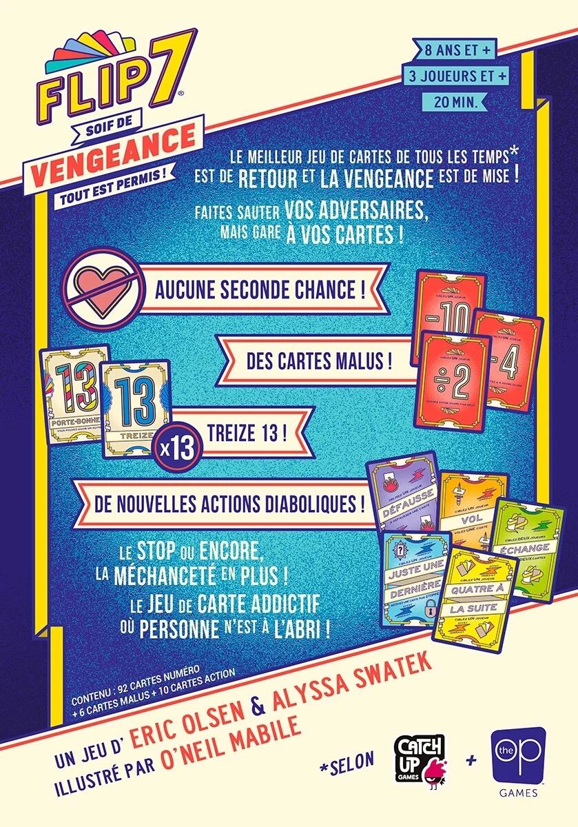 Flip 7 Vengeance revisite le célèbre jeu de Stop ou Encore Flip 7 en y injectant une bonne dose d’interaction et de chaos. Si vous connaissez déjà Flip 7, vous retrouverez immédiatement ses sensations : à chaque tour, vous choisissez entre continuer à piocher pour augmenter votre score… ou vous arrêter à temps pour sécuriser vos points. Mais attention : tirer un numéro déjà présent dans votre collection vous élimine instantanément de la manche !