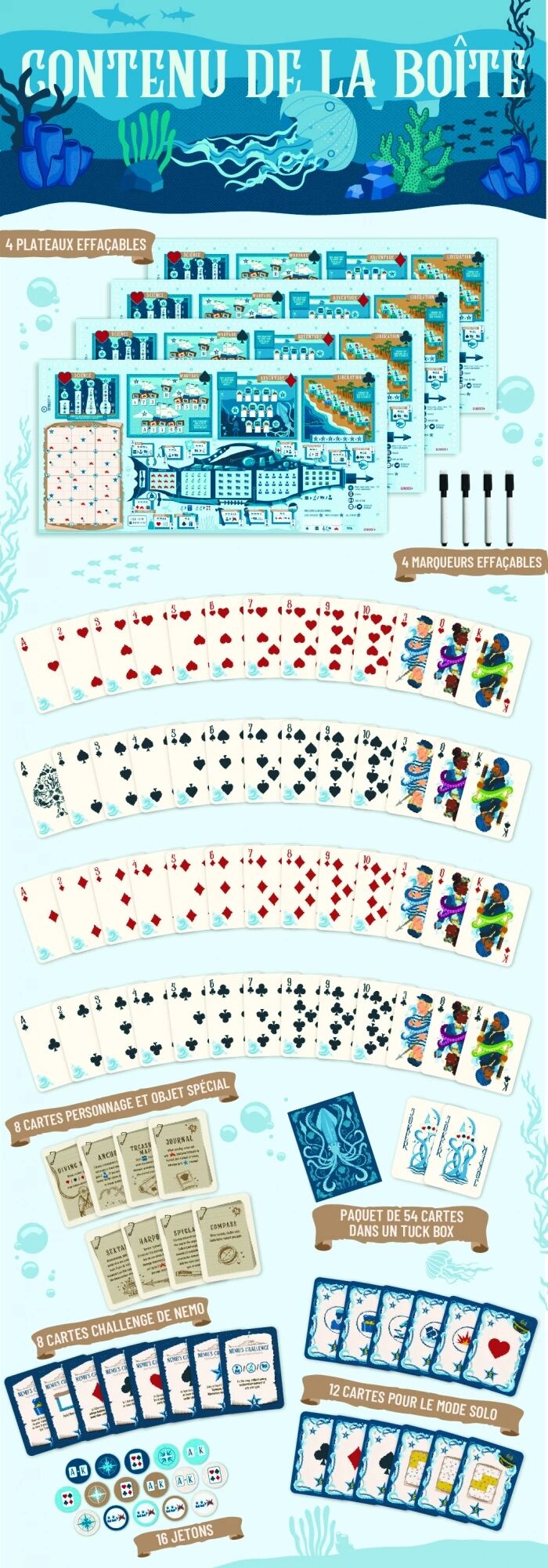 4 plateaux effaçables à sec, 1 paquet de 54 cartes dans son étui, 12 cartes solo La Poursuite de Farragut, 8 cartes Challenge de Nemo, 8 cartes Personnage, 4 marqueurs effaçables, 16 jetons Phase, 1 livret de règles.
