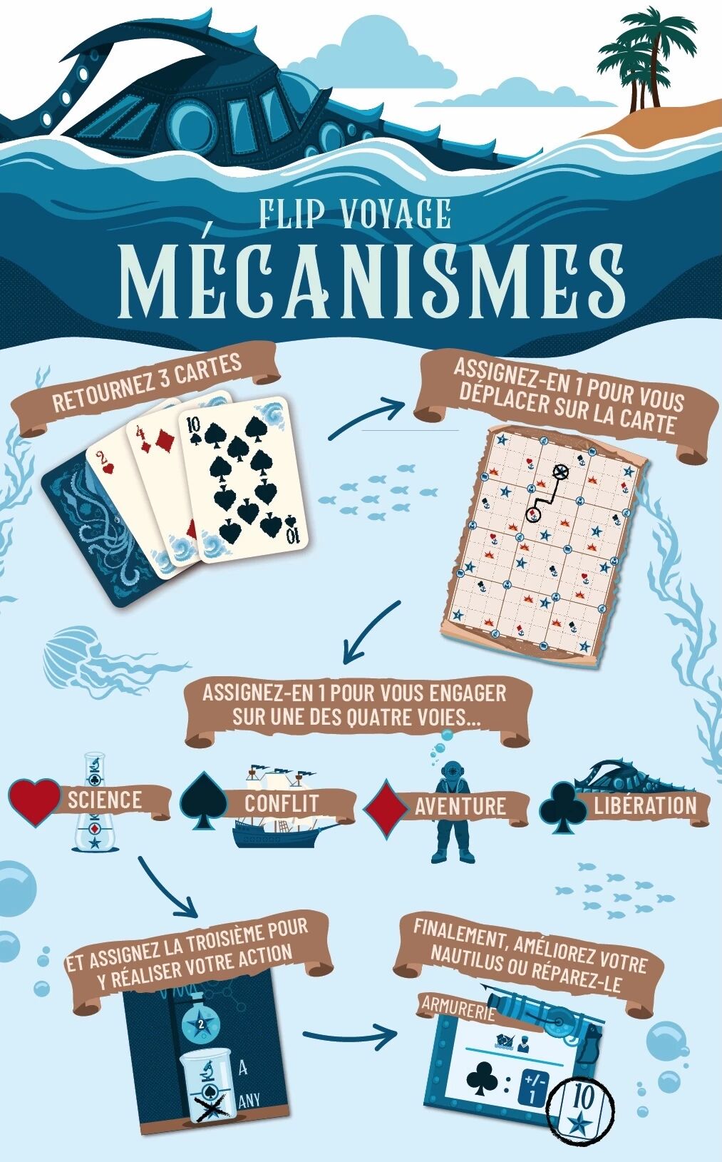 Dans le jeu Flip Voyage, chaque joueur incarne un membre de l’équipage du Nautilus et doit optimiser son voyage à travers les profondeurs en combinant exploration, gestion de ressources et choix stratégiques.