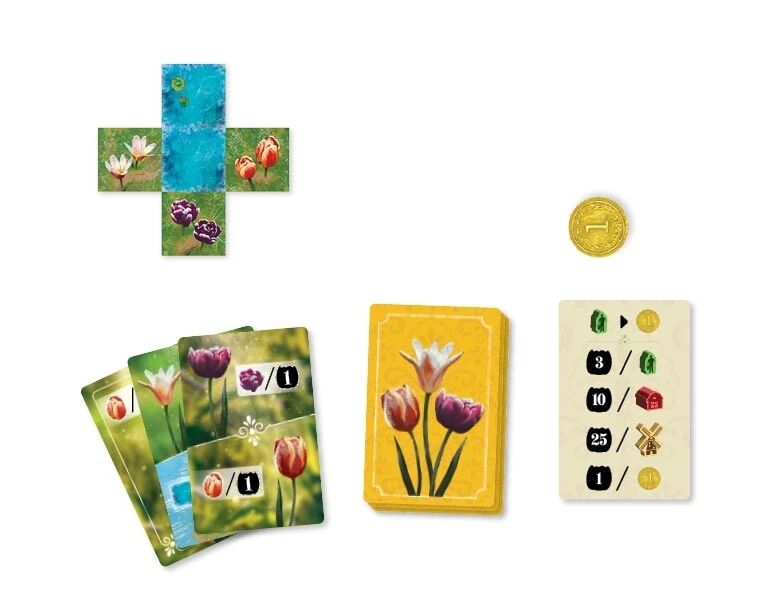1 plateau, 44 tuiles Paysage recto verso, 4 tuiles de départ, 40 cartes Paysage, 15 cartes Maître Jardinier (mode solo), 45 jetons Amélioration (jardiniers, granges, moulins), 21 tuiles Objectif, 40 pièces, 4 aides de jeu, 1 sac en tissu, 1 jeton Fleur, 1 bloc de score, 4 marqueurs de score et les règles de jeu