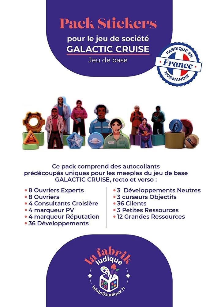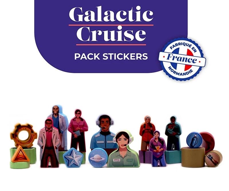 Ajoutez du style et de la lisibilité à vos parties de Galactic Cruise (Jeu de base) grâce à ce pack de stickers conçu pour le jeu ! Chaque autocollant vient embellir les pions en bois pour une immersion renforcée.