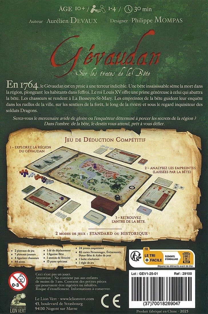Gévaudan propose deux expériences complémentaires : un mode Standard, idéal pour découvrir les mécaniques, et un mode Historique plus riche, intégrant personnages emblématiques et événements inspirés des faits réels. Un mode solo est également inclus, renforçant encore la rejouabilité. Immersif, tendu et accessible, Gévaudan est un jeu de déduction original qui renouvelle brillamment le genre.